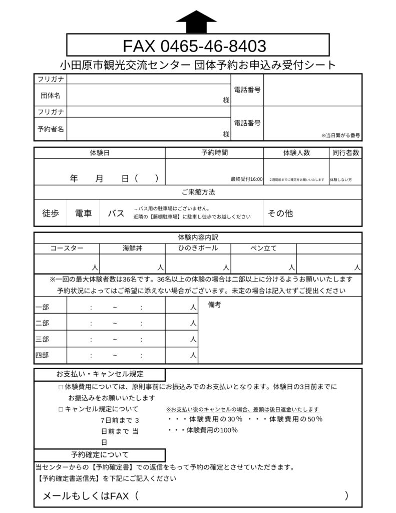 また観光交流センターにご連絡後、申し込みシートをFAXにてお送り下さい。